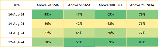 Analyzing market breadth is important as it provides insight into the underlying strength or weakness of the market, beyond just looking at benchmark indices. Breadth measures the percentage of securities in NIFTY 500 surpassing specified moving averages over the specified period. Comparing the market breadth of nifty 500 during the previous week's trading sessions, we can analyze that number of stocks above key moving average support areas are reducing by the end of week. This can be considered as a sign of weakness if change is seen to be significant.